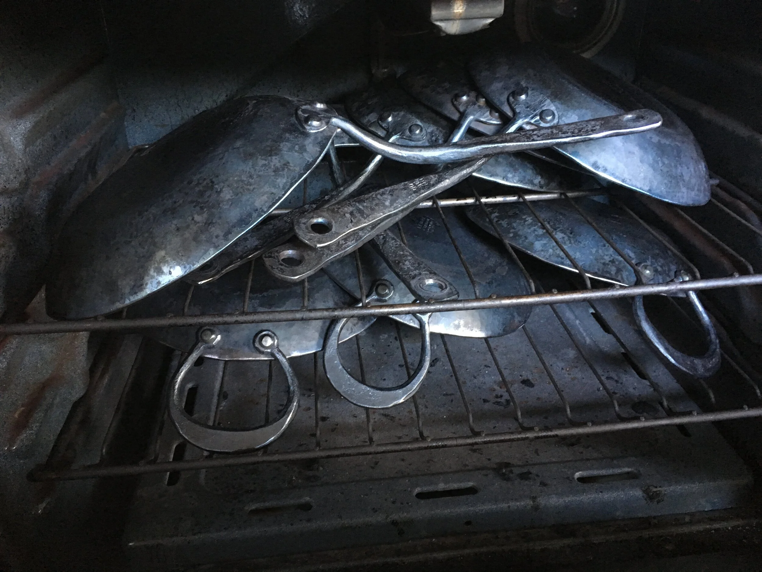Wipe off the excess oil (the pan should appear wet but not greasy), and place the pan upside down on the middle rack of the oven.